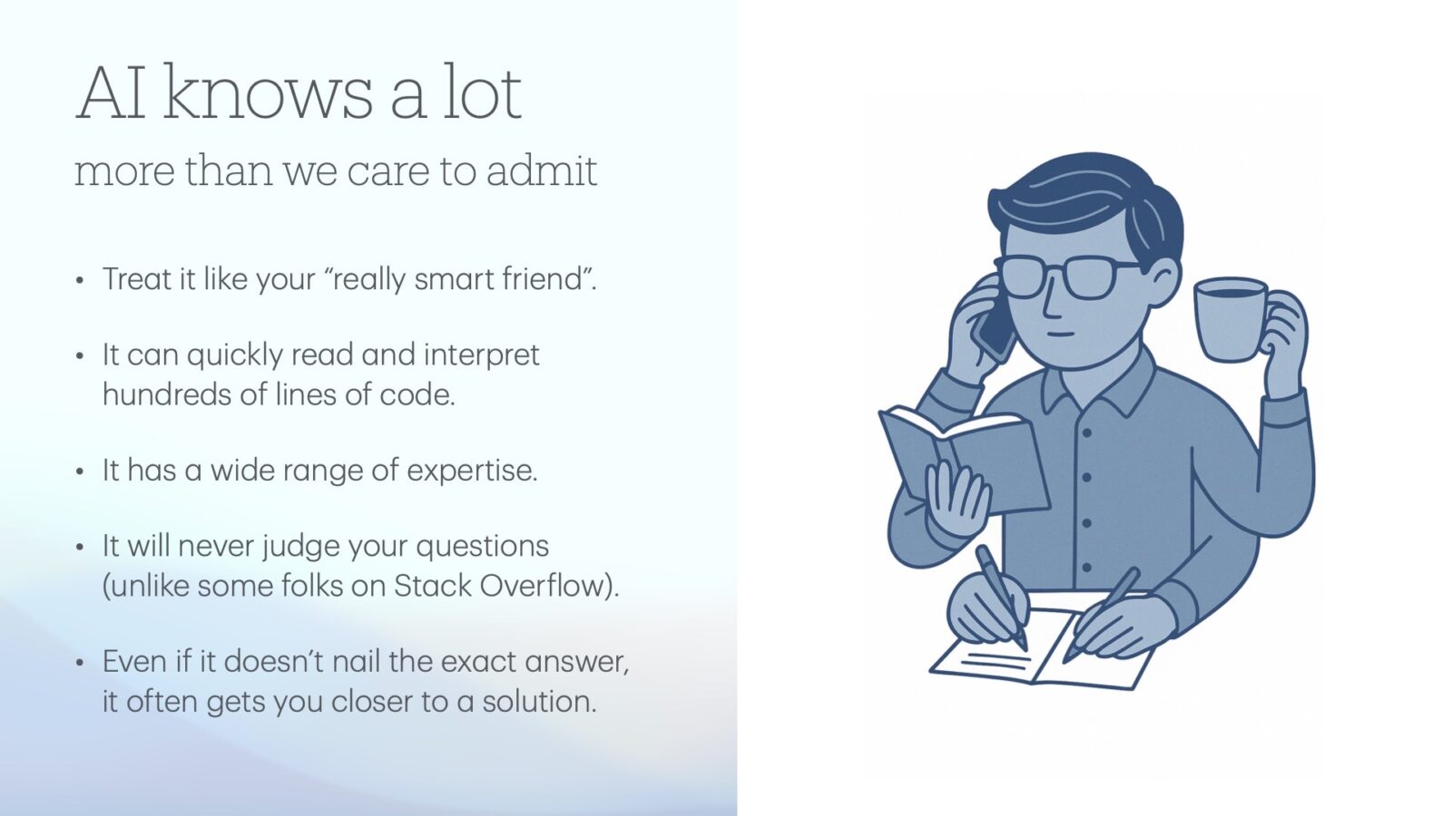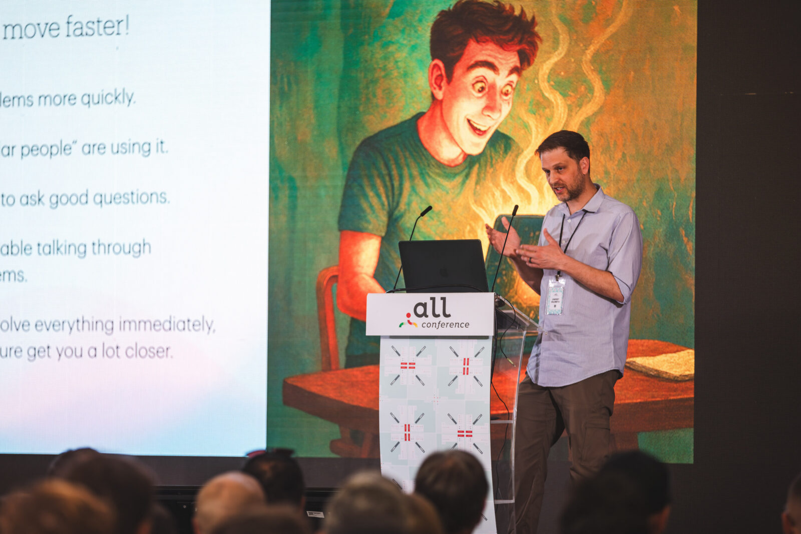 The talk was entitled Me, Myself, and AI — Using modern tools to never get stuck again. It began with an overview of AI, including the pros & cons, why we should use it, and how the technology will shape our future. The latter half of the presentation was focused on specific tips and tricks for modern developers to leverage AI.